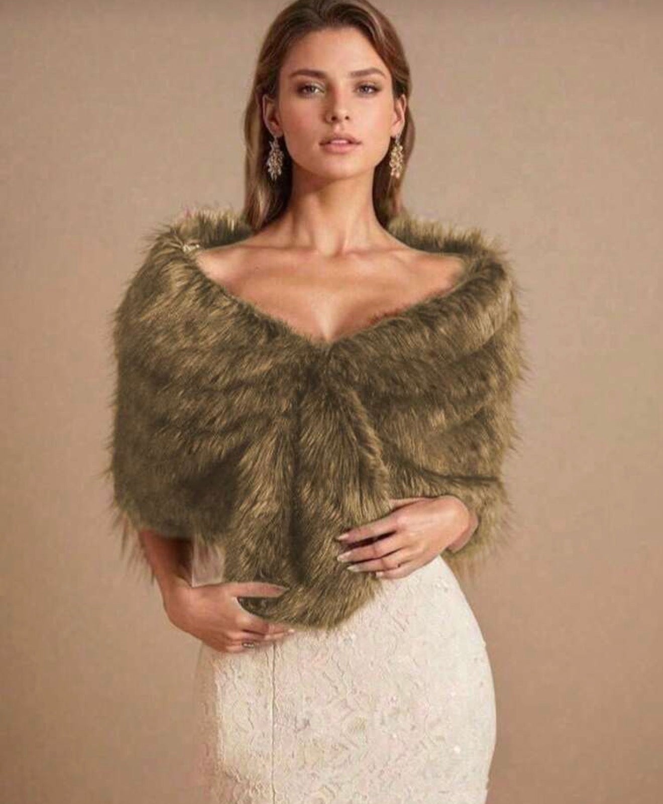 Perfect for winter weddings and elegant soirées, this faux-fur bridal wrap adds a touch of royal warmth to any special occasion look. Designed in a soft golden-brown tone, it drapes beautifully over the shoulders, giving a luxurious vintage feel while providing cozy comfort. Its smooth lining and structured cut make it ideal for wearing over wedding dresses, evening gowns, and formal outfits.