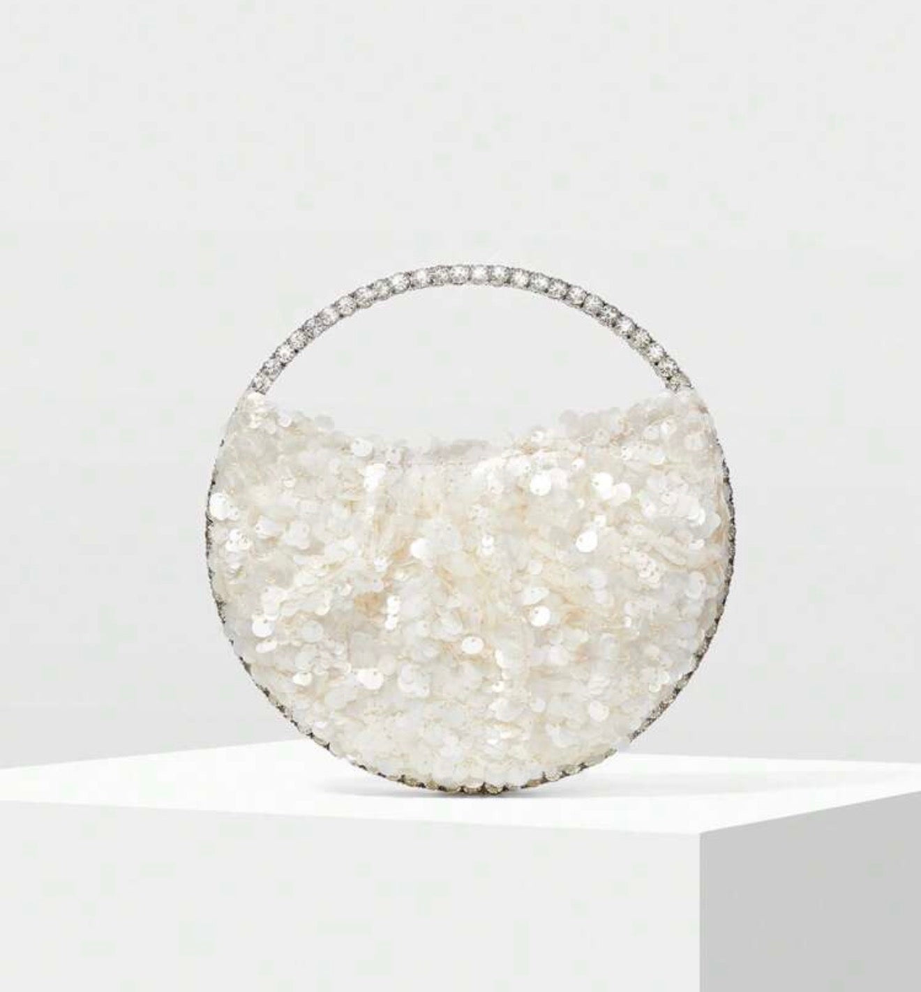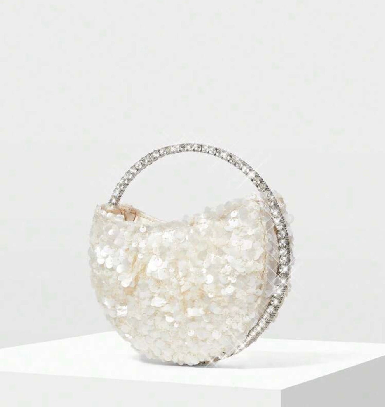This sparkling crescent-shaped clutch is designed with layered white sequins that catch the light beautifully, paired with a crystal-embellished circular handle for a luxurious, refined finish. Perfect for evenings, weddings, engagements, and special events, this piece adds instant glamour to any outfit.