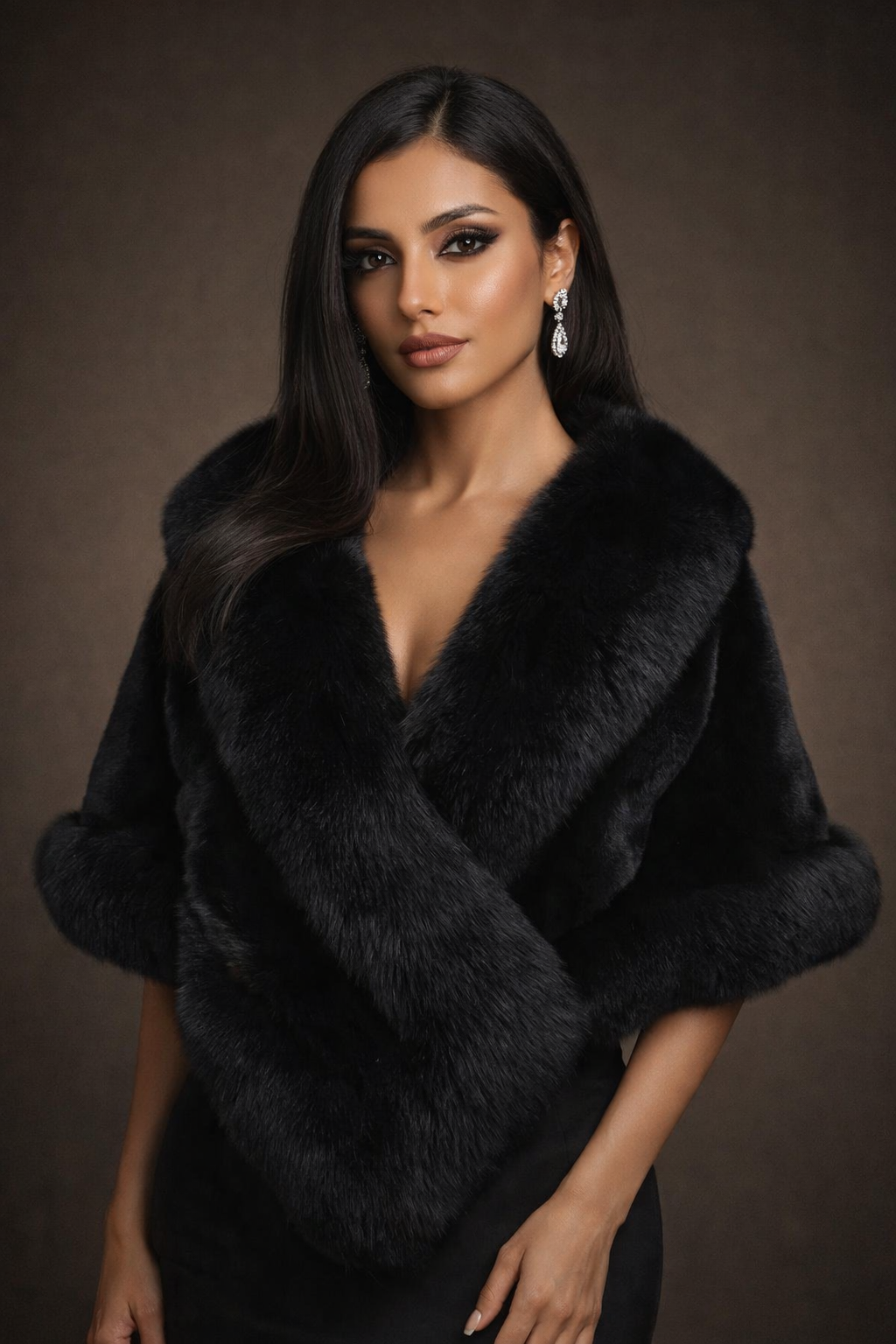 A luxurious black faux-fur shawl. Designed to add instant sophistication to any outfit, it features an ultra-soft, plush texture that feels warm, smooth, and irresistibly cozy against the skin. The oversized silhouette drapes beautifully over the shoulders, creating a refined, high-fashion look perfect for winter evenings, special occasions, or elevating everyday style.