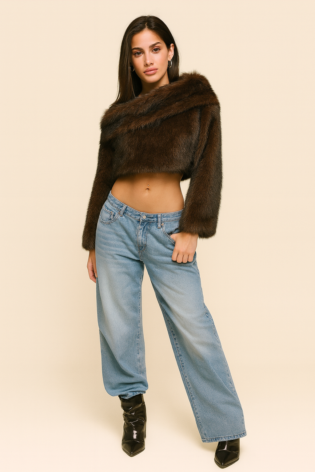 Elevate your winter style with this luxurious faux-fur cropped top, designed to add instant glamour to any outfit. Featuring a rich dark-brown tone with a soft, plush texture, this off-shoulder fur top highlights your neckline beautifully while keeping you warm and chic. The long sleeves and cropped cut create a flattering silhouette that pairs effortlessly with high-waisted jeans, skirts, or tailored trousers.