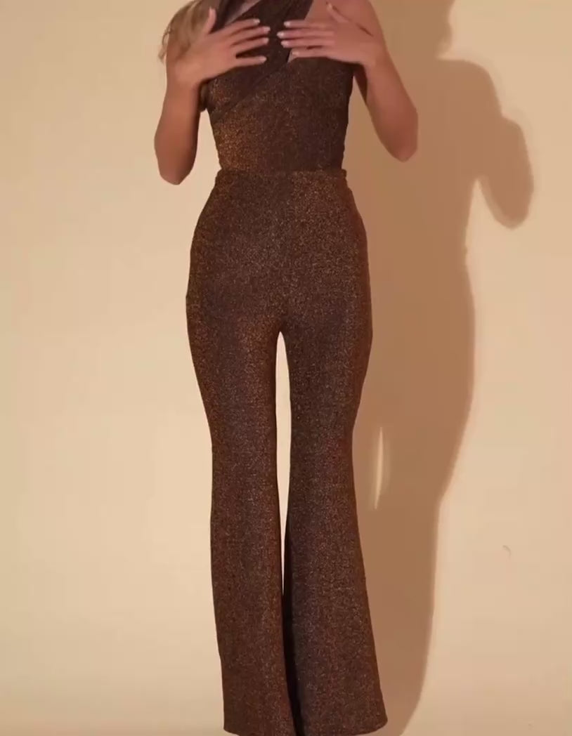 The asymmetric one-shoulder neckline adds a modern, high-fashion edge, while the flared leg silhouette elongates the body, creating a sleek and elegant shape. Its subtle sparkle catches the light with every move — perfect for evening events, cocktail parties, or festive nights out.