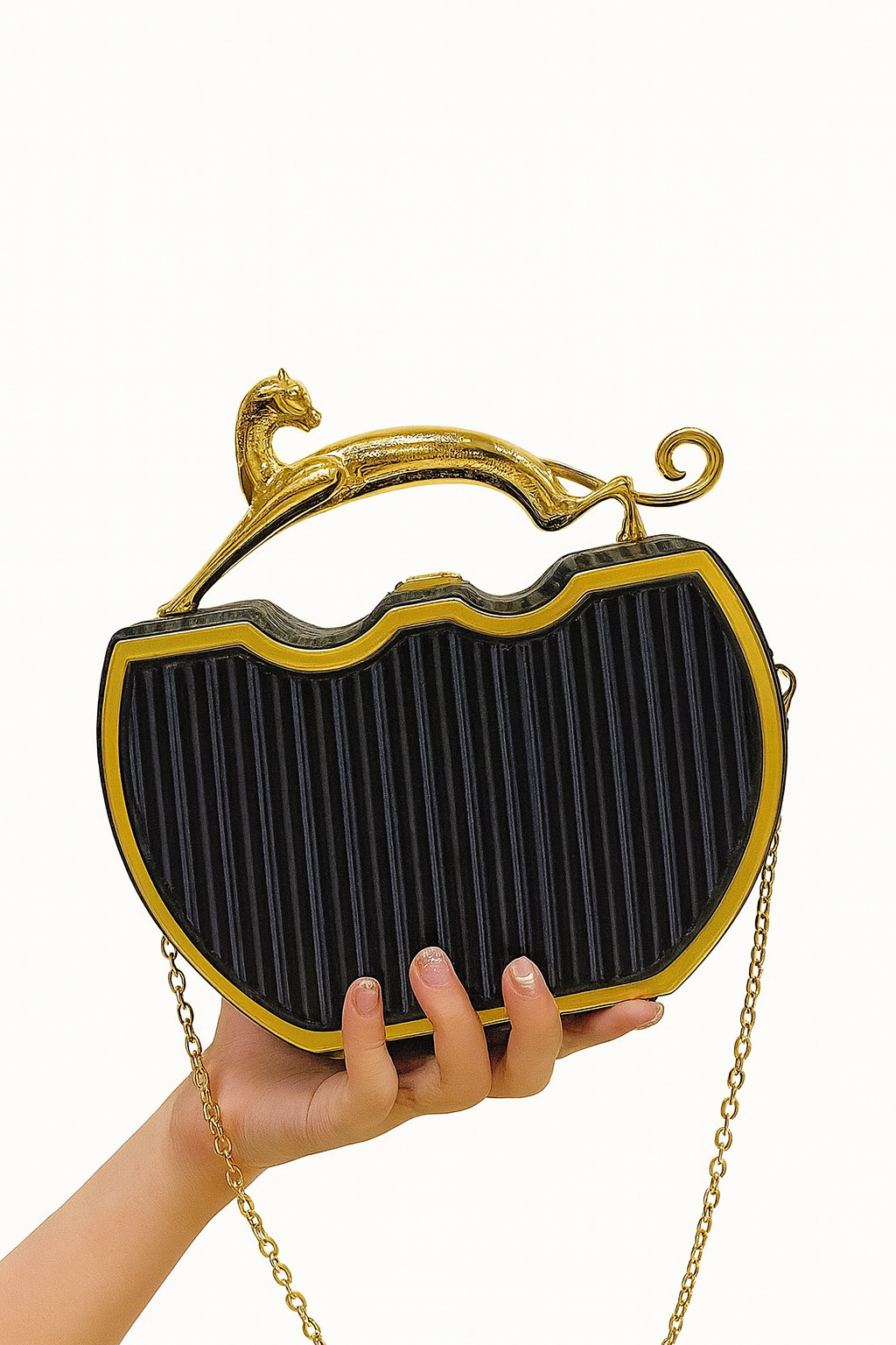 Perfect for evenings out, formal events, or elevating a simple look, this clutch is lightweight yet structured, with enough space for your essentials—phone, keys, cards, and a lipstick. Comes with a detachable gold chain for versatile styling: carry it as a handbag or wear it crossbody.